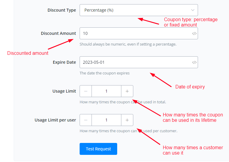 | { “id”: 4598, “code”: “test12”, “amount”: “10.00”, “status”: “publish”, “date_created”: “2023-04-14T14:27:49”, “date_created_gmt”: “2023-04-14T14:27:49”, “date_modified”: “2023-04-14T14:27:49”, “date_modified_gmt”: “2023-04-14T14:27:49”, “discount_type”: “percent”, “description”: “test coupon”, “date_expires”: “2023-05-01T00:00:00”, “date_expires_gmt”: “2023-05-01T00:00:00”, “usage_count”: 0, “individual_use”: false, “product_ids”: [ ], “excluded_product_ids”: [ ], “usage_limit”: 1, “usage_limit_per_user”: 1, “limit_usage_to_x_items”: null, “free_shipping”: false, “product_categories”: [ ], “excluded_product_categories”: [ ], “exclude_sale_items”: false, “minimum_amount”: “0.00”, “maximum_amount”: “0.00”, “email_restrictions”: [ ], “used_by”: [ ], “meta_data”: [ ] }  |