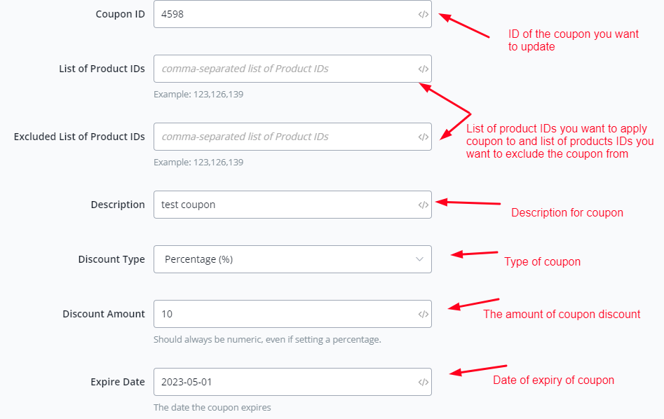 This action is used to update a coupon using its coupon ID.
