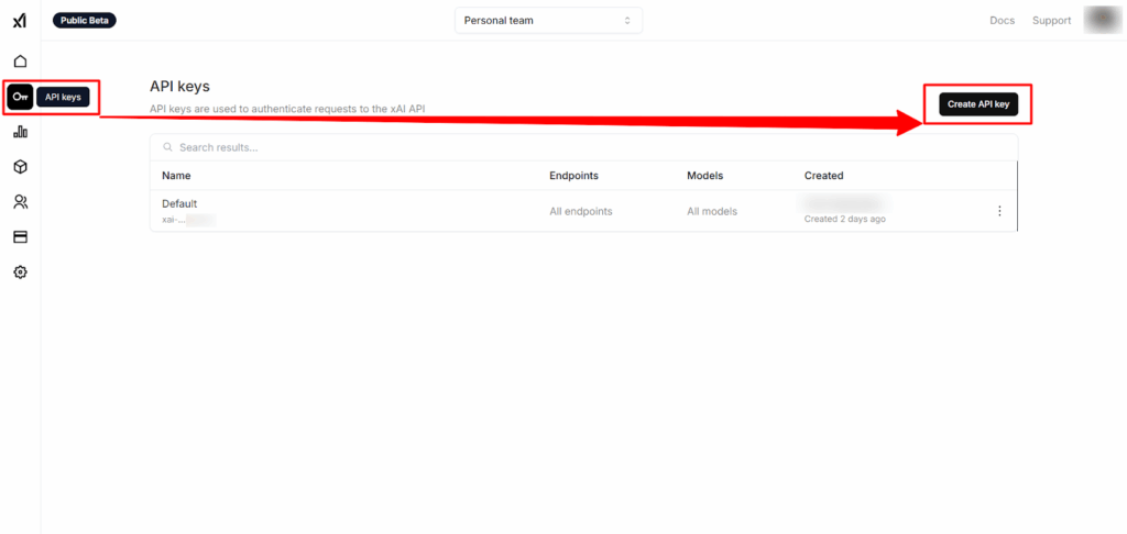 To start using the Welcome | xAI integration, you first need to create an API key. In your browser navigate to the Welcome | xAI platform and within your account you can follow the instructions in the image below to generate your unique API key.