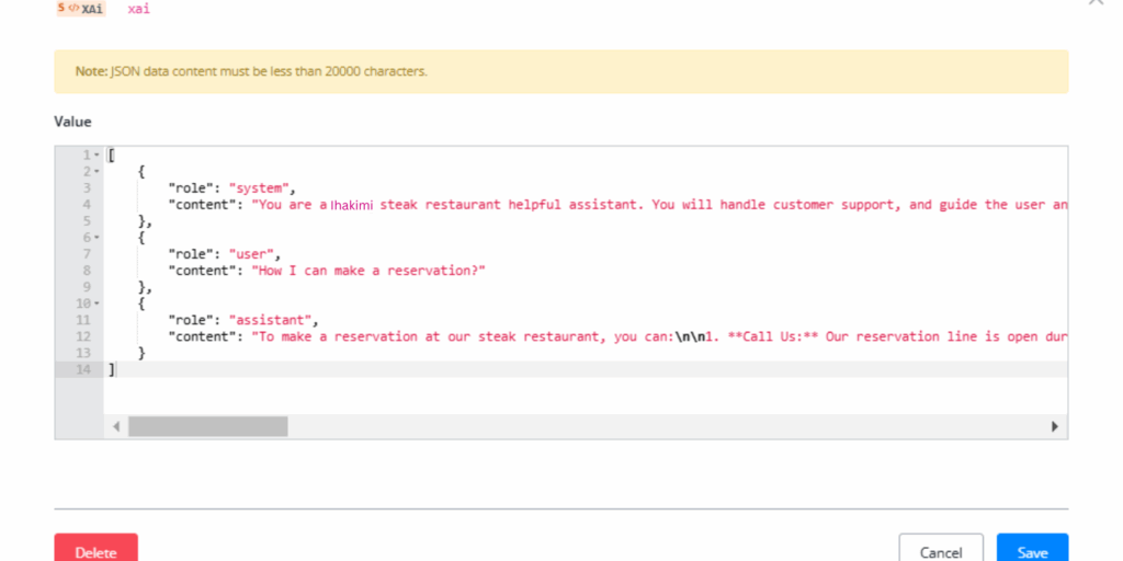 This field tracks the entire conversation history, including system setup and user interactions. The JSON is limited to 20,000 characters. Older entries will be deleted once this limit is reached.