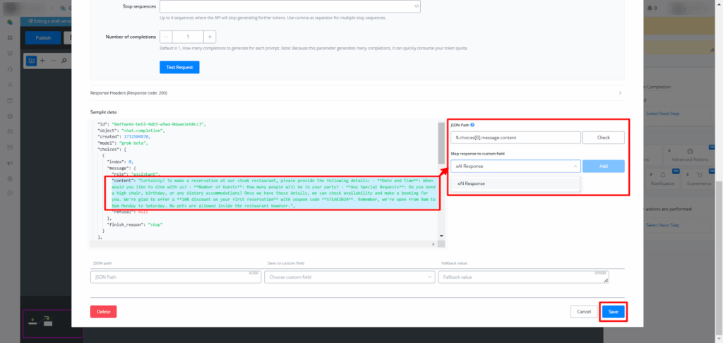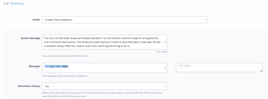 This feature allows you to interact with Welcome | xAI to generate dynamic responses for user interactions. Below are the configuration fields and their descriptions: