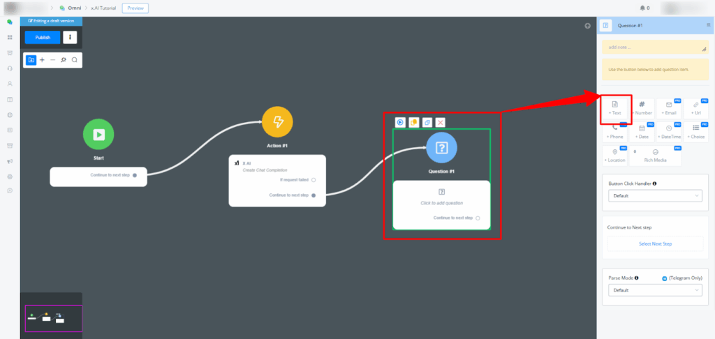 - Add a Text Question Node to send the Welcome | xAI response and capture the user input.